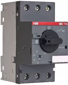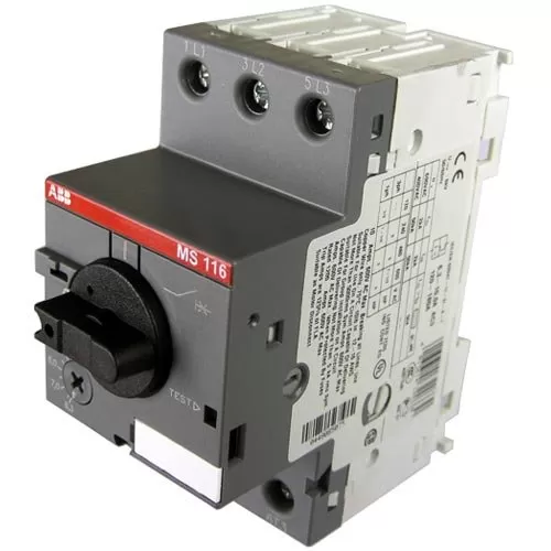 Автомат защиты двигателя ABB MS116 — это устройство защиты главной цепи. Он объединяет в себе устройство управления и защиты электродвигателя. В основном автоматические выключатели используют для ручного включения/выключения электродвигателей, их защиты и установки от короткого замыкания, перегрузки и обрыва фазы без применения плавких предохранителей. Оборудование для защиты электродвигателей без плавких предохранителей позволяет сократить расходы, пространство и обеспечить быстрое реагирование в случае возникновения короткого замыкания посредством выключения электродвигателя на протяжении нескольких миллисекунд.