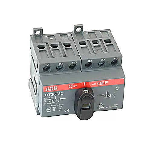 Рубильник ABB OT25F3C25A 3-полюсный — небольшой реверсивный рубильник, который состоит из двух стандартных 3-полюсный выключателей нагрузки, соединенных между собой особым механизмом, предотвращающим включение второго источника питания при включенном первом. У прибора предусмотрена маркировка на 3 положения и используется с целью ввода резервной линии.